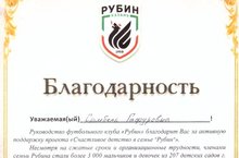 Руководство футбольного клуба "Рубин" выразило благодарность заведующей, Мухаметовой Сюмбель Гафуровне, за активную поддержку проекта "Счастливое детство в семье "Рубин" ".