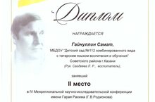 Воспитанник Гайнуллин Самат (воспитатель Сагдеева Л.Р.), воспитатель по обучению татарскому языку Бедертдинова Г.М., старший воспитатель Сабирзянова А.А., музыкальный руководитель Сайфутдинова Д.Н. приняли участие в IV межрегиональной научно-исследовательской конференции имени Гарая Рахима и заняли 2 место. Поздравляем участников с успешным выступлением!