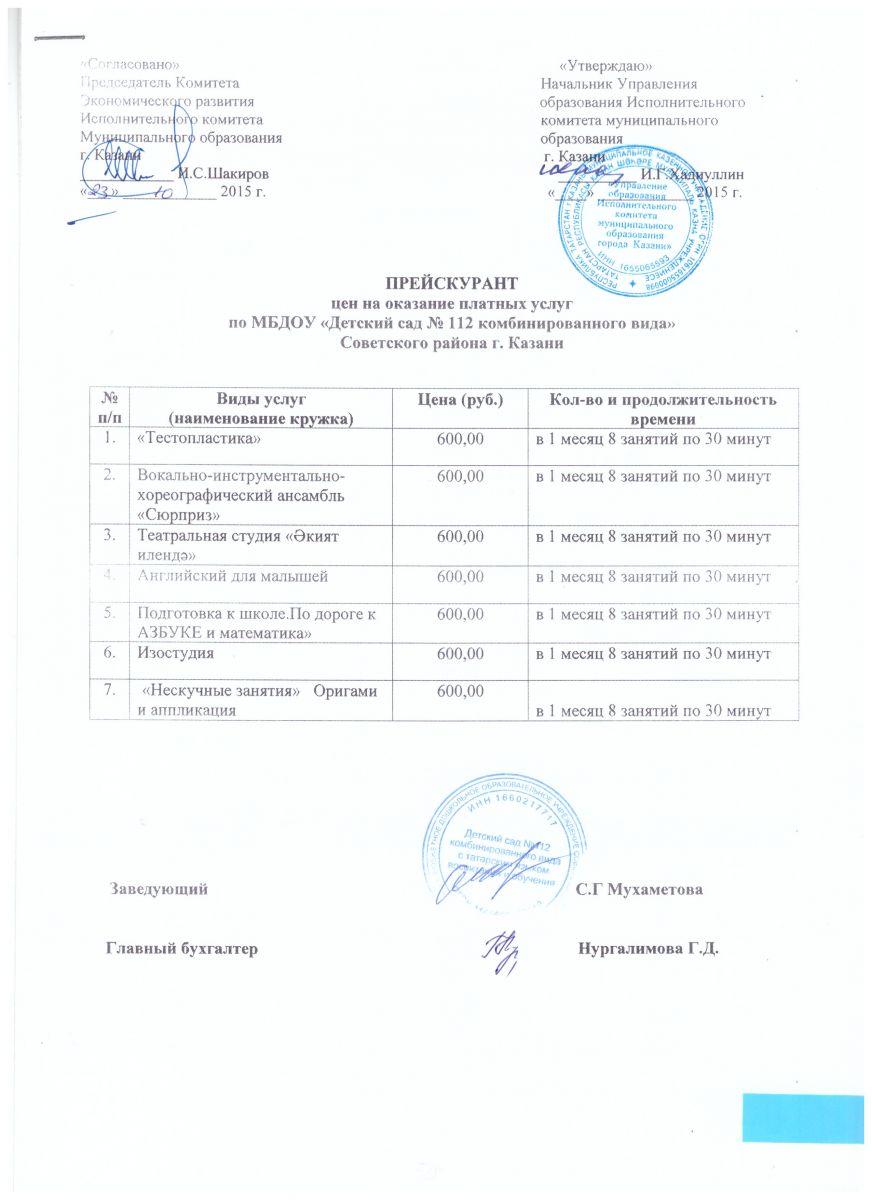 Прейскурант цен на оказание платных услуг. "Гимнастика для детей".