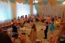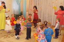 Сегодня в детском саду состоялись осенние утренники в двух группах. В первую и вторую младшую Б группы в гости к детям пришла сама виновница торжества - Осень. Она пригласила ребят поиграть в игру "Солнышко и дождик".