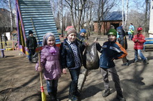 Этот день мы сегодня отметили небольшим развлечением на улице. В конце праздника все дети вместе с воспитателями отблагодарили нашу Землю – уборкой территории.