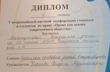 10нчы сыйныф укучысы Мәхмутова К. "Хокук хәзерге җәмгыятьнең нигезе" дип аталган укучыларның һәм студентларның V Бөтенроссия фәнни конференциясендә фәнни эше белән чыгыш ясады һәм III дәрәҗәдәге дипломга лаек булды. Аны һәм аның җитәкчесе Бариева Р.Ә.ны котлыйбыз һәм киләчәктә дә уңышлар телибез!