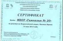 Гимназия №20 включена в Национальный реестр" Ведущие образовательные учреждения России-2012" 07.06.2013