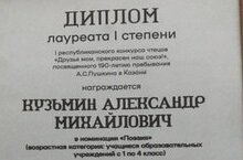 Поздравляем ученика 4 Б класса Кузьмина Александра с победой в l республиканском конкурсе чтецов «Друзья мои, прекрасен наш союз!» посвященного 190-летию пребывания А.С.Пушкина в Казани. Молодец! Желаем творческих успехов!