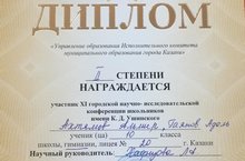 Ученики 10 класса Ахтямов Альмир и Гаянов Адель участвовали в XI городской научно-исследовательской конференции школьников имени К.Д. Ушинского и были награждены Дипломом 2 степени! Научный руководитель - Хафизова Лилия Абдуллазяновна. Поздравляем их!