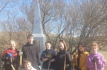 Ученики 7В класса на субботнике у подшефного памятника воинам-освободителям в поселке Аки.