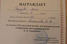 Отмечаем ученицу 3 класса Газизову Лейлу и ее научного руководителя Мельникову И.А.за участие в XI городской научно-практической школьников имени К.Д. Ушинского.