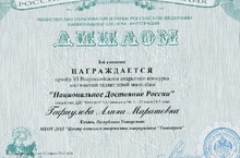 Гафиулова Алина, ученица 10Б класса, стала призёром и получила диплом 1 степени на VI Всероссийском открытом конкурсе достижений талантливой молодёжи "Национальное достояние России". 16.04.2012