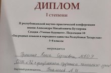 Гришину Алису (Диплом I степени, Подсекция 10 "Год родных языков и народного единства Республики Татарстан", 5-8 классы, научный руководитель - Бикмаев А.И.);