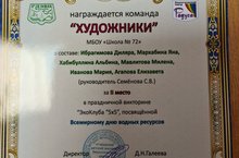 Поздравляем команду "Художники" в составе Ибрагимовой Диляры, Мархабиной Яны, Хабибуллиной Альбины, Мавлитовой Милены, Ивановой Марии, Агаповой Елизаветы (под руководством Семеновой С.В.) со II местом в праздничной викторине "ЭкоКлуб "5х5", посвященной Всемирному дню водных ресурсов, при Городском детском эколого-биологическом центре.