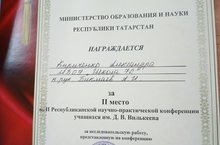 В школе №23 Ново-Савиновского района г.Казани прошла II Республиканская научно-практическая конференция учащихся им. Д.В.Вилькеева. Кириченко Александра, ученица 8А класса школы №72, заняла 2 место (секция «Русская филология», учитель Бикмаев А.И.). Поздравляем Сашу и желаем дальнейших успехов на конференциях!