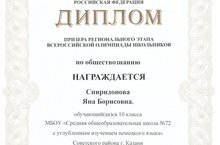 Спиридонова Яна стал призёром регионального этапа всероссийской олимпиады школьников по обществознанию. Поздравляем Яну и желаем дальнейших успехов!