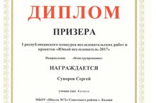 В Городском центре творческого развития и гуманитарного образования для одарённых детей г.Казани прошёл I Республиканский конкурс исследовательских работ и проектов "Юный исследователь - 2017". Суворов Сергей, ученик 4Б класса, стал призёром в секции "Конструирование" (учитель Измайлова М.Н.). Поздравляем Сергея с очередной победой и желаем дальнейших успехов!