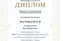 8-9 февраля 2016 года в Казани прошёл региональный этап всероссийской олимпиады школьников по немецкому языку. Нашу школу на данной олимпиаде представляли восемь учениц, две из которых стали призёрами. Поздравляем Спиридонову Яну, ученицу 8А класса, и Бастракову Анастасию, ученицу 10А класса, ставших призёрами региональной олимпиады по немецкому языку!!! Желаем Яне и Насте дальнейших успехов!