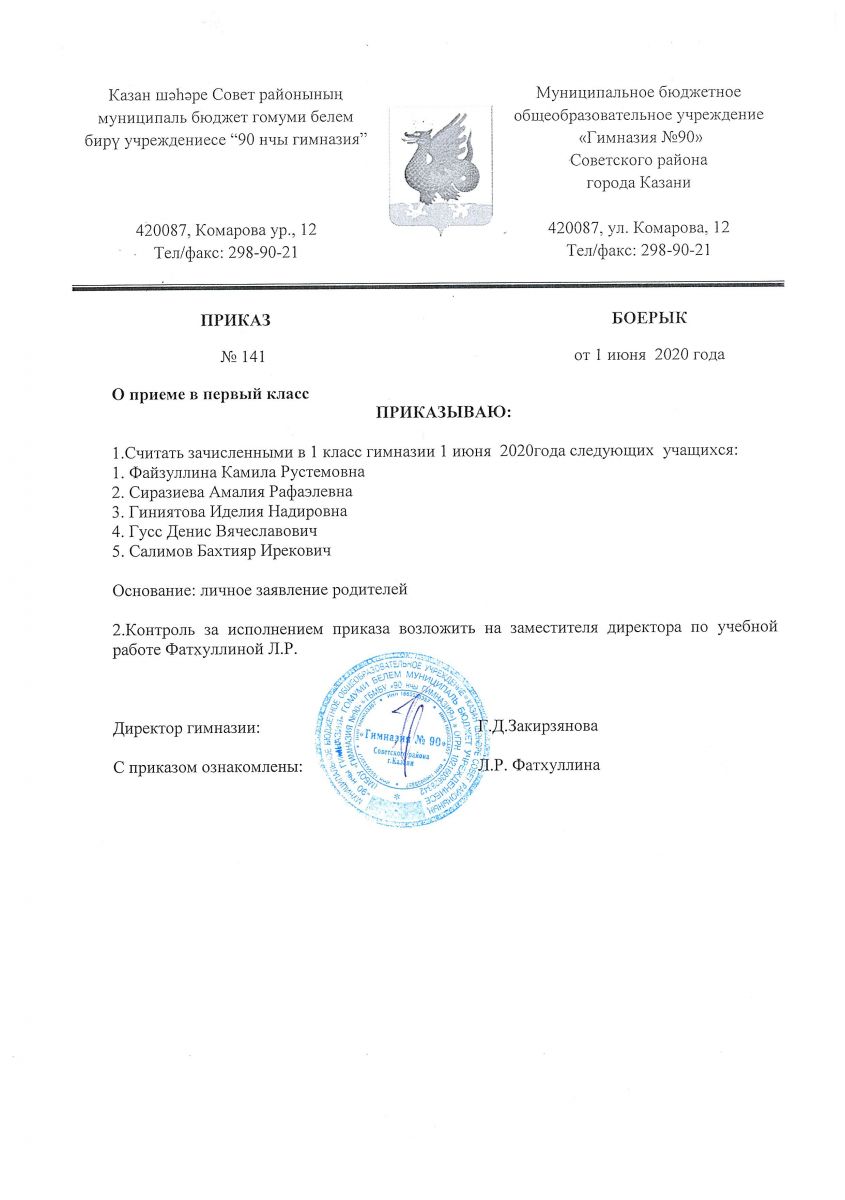 Приказ МБОУ "Гимназия №90" №141 от 01 июня 2020 года "О приеме в первый класс"