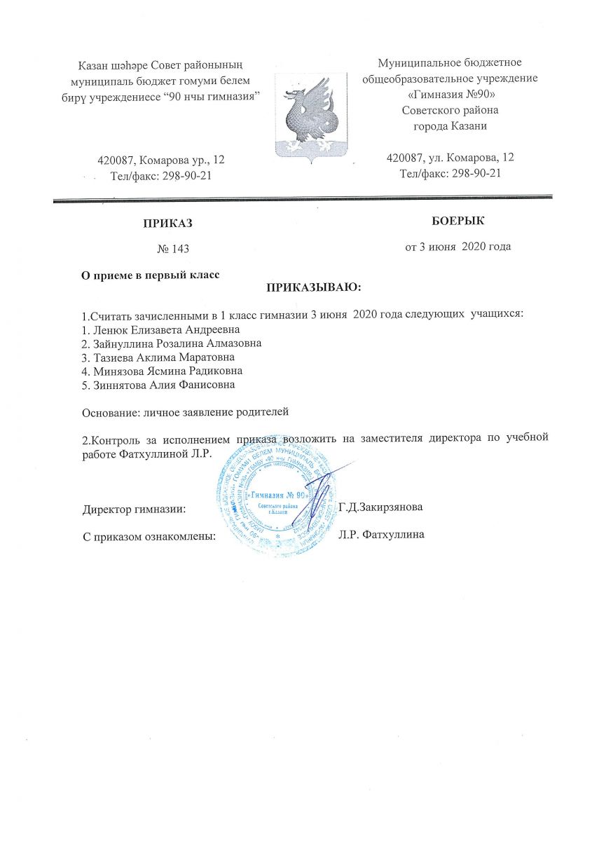 Приказ МБОУ "Гимназия №90" №143 от 03 июня 2020 года "О приеме в первый класс"