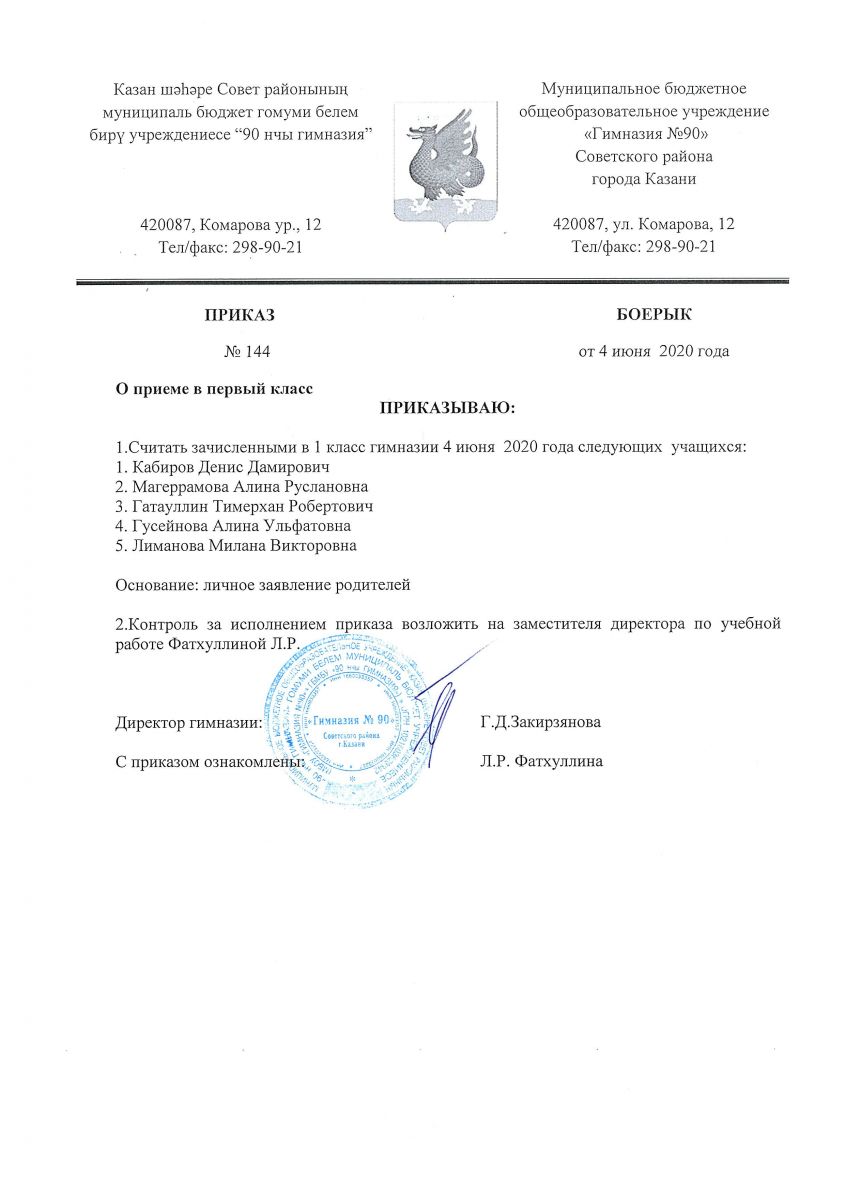 Приказ МБОУ "Гимназия №90" №144 от 04 июня 2020 года "О приеме в первый класс"