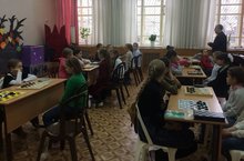 Любители интеллектуальных игр собрались на городском турнире . Шахматы и шашки на столах игроков.Мальчики и девочки начальных классов будут бороться за победу.