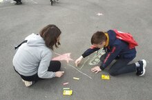 В рамках праздника "Наследники Великой Победы" ученики 1,2,4 классов рисовали на асфальте рисунки о мире, дружбе, семье. Никто не остался в стороне, все ребята получили подарки от организаторов праздника!