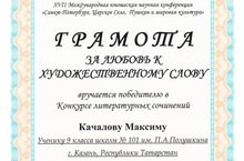 Работа Качалова Максима, ученика 9б класса, победителя конкурса литературных сочинений 17 Международной юношеской научной конференции "Санкт-Петербург, Царское Село, Пушкин и мировая культура", который состоялся 16-20 октября 2015 года в городе Санкт - Петербург. "2005 год. Мне 5 лет. Каждый вечер мама читала на ночь русские народные сказки.
