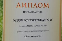 Дипломом награждается Коллектив учащихся 1 класса МБОУ "ООШ №108" призер конкурса детского рисунка "Лето на память"