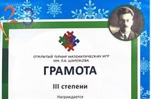 На открытом турнире математических игр им.П.А.Широкова Селезнев Д., ученик 4 класса, в составе сборной Советского района г.Казани удостоился грамоты III степени (учитель - Ибрагимова Г.Р.) поздравляем!