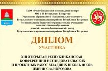 На XIII открытой республиканской конференции исследовательских и проектных работ младших школьниклв им. С.Ф.Морозова дипломом участников награждены Мулюкина В., Горбунова У., ученицы 4 класса (руководитель - Ибрагимова Г.Р.). Молодцы!