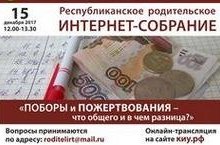 Республиканское родительское интернет-собрание по теме "Поборы и пожертвования - что общего и в чем разница" состоится 15 декабря. Онлайн трансляция на сайте кау.рф будет проводиться с 12.00 - 13.30.