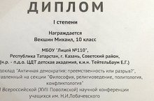 Поздравляем ученика 10 "а" класса Векшина Михаила, который принял участие в I Всероссийской ( XVII Поволжской ) научной конференции учащихся им. Н.И. Лобачевского и получил диплом I степени.