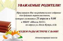 25 апреля (суббота) в 9:00 в актовом зале школы №111 состоится собрание для родителей будущих первоклассников.