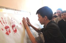 После этого 200 школьников, совместно с организатором акции, участником Республиканского проекта "Кадровый Резерв" 2015 года, Аскаром Галимовым и его помощниками, с помощью красных отпечатков своих ладоней создали огромное полотно под названием "Отпечаток Войны"