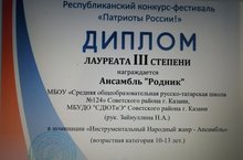 В целях выявления и трансляции лучших практик организации патриотического воспитания детей и подростков 17 ноября 2021 года прошёл республиканский конкурс «Патриоты России!». Дипломом лауреата III степени был награждён наш ансамбль «Родник», художественный руководитель Зайнуллина Н.А. Поздравляем!!!