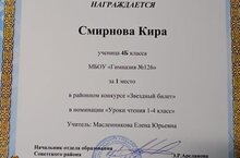 Поздравляем ученицу 4 Б класса Смирнову Киру. Диплом I степени в районном конкурсе "Звездный билет" в номинации "Уроки чтения 1-4 класс". Благодарим за подготовку учителя начальных классов Масленникову Елену Юрьевну. Желаем дальнейших успехов и побед.
