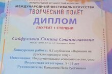 Поздравляем ученицу 3 А класса Сайфуллину Самину - Диплом I степени в Международном фестивале искусств "Творческий полет". Благодарим за подготовку педагога ДМШ №7 Камалееву Нелю Рустэмовну. Желаем дальнейших успехов и творческих побед.