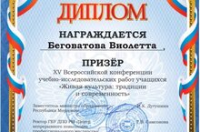 Поздравляем ученицу 10 А класса, Беговатову Виолетту, Призер XV Всероссийской конференциии учебно-исследовательских работ учащихся «Живая культура: традиции и современность», НПК проходила в городе Саранске. Желаем дальнейших успехов и побед.