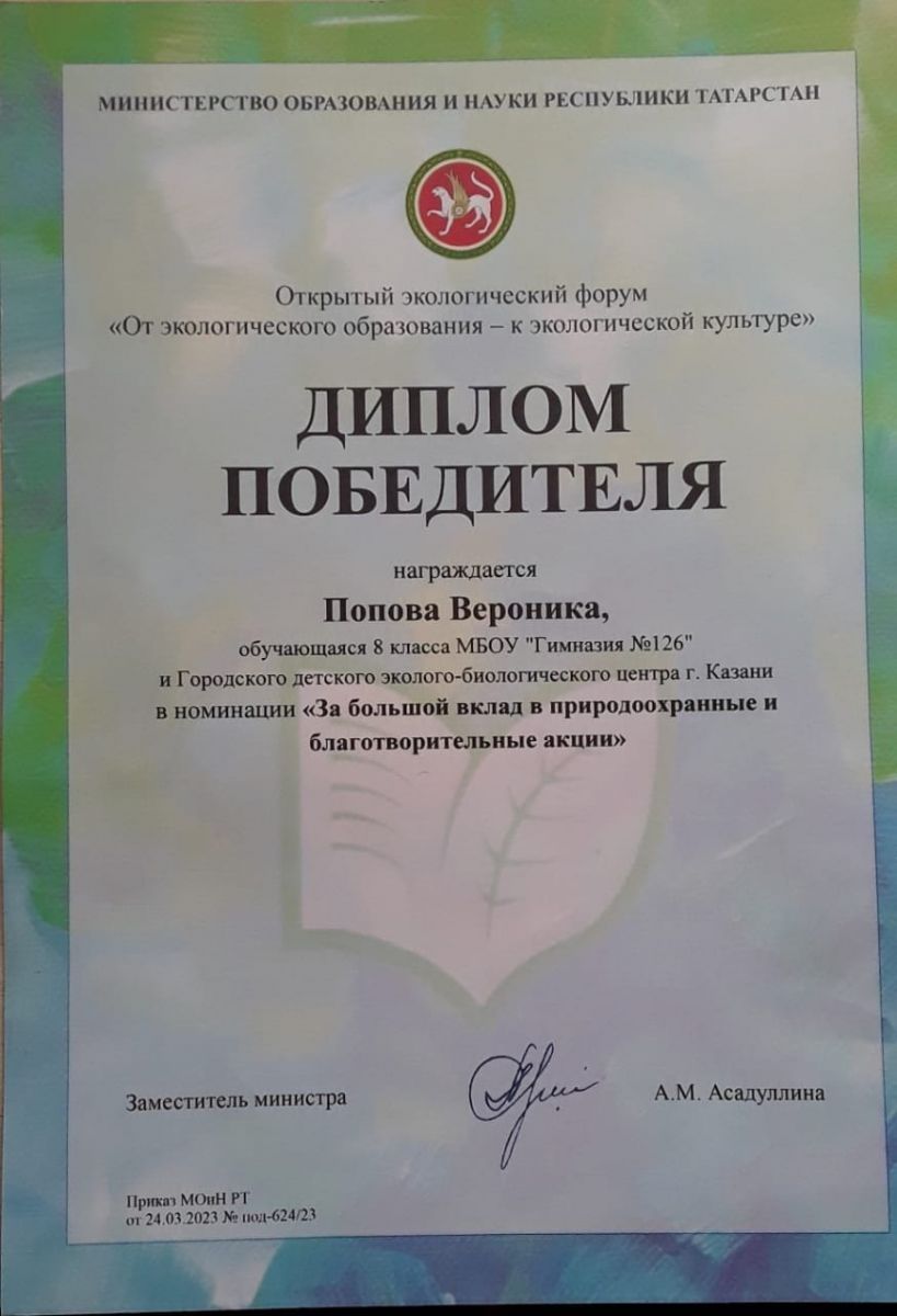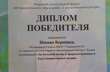 Поздравляем ученицу 8А класса Попову Веронику. Она - победитель Республиканского форума "От экологического образования - к экологической культуре". Желаем дальнейших успехов и побед.