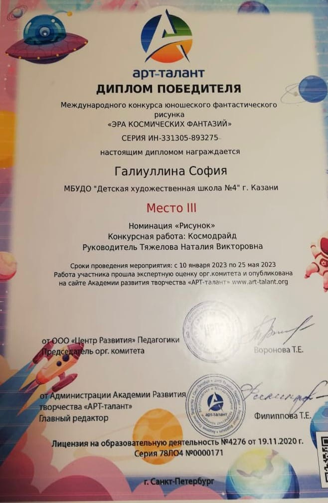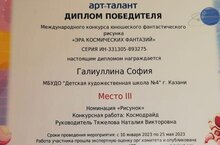Поздравляем ученицу 3А класса, Галиуллину Софью. Диплом победителя, III место в Международном конкурсе юношеского фантастического рисунка "Эра космических фантазий". Благодарим за подготовку педагога ДХШ №4 Тяжелову Наталью Викторовну. Желаем дальнейших успехов и побед.