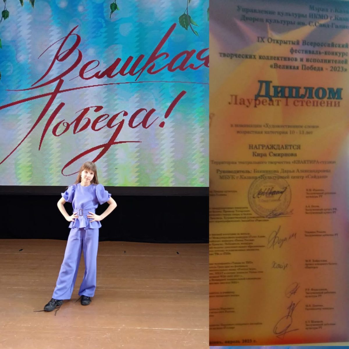 Поздравляем ученицу 4 Б класса, Смирнову Киру с победой! Диплом I степени в IX Открытом Всероссийском фестивале-конкурсе творческих коллективов и исполнителей "Великая Победа-2023". Благодарим за подготовку педагога КЦ "Сайдаш" Банникову Дарью Александровну. Желаем дальнейших успехов и побед.