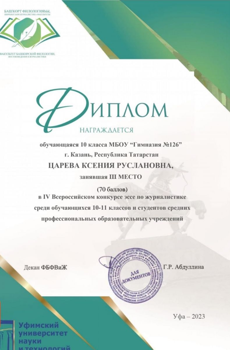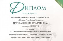 Поздравляем ученицу 10 А класса, Цареву Ксению. III место в IV Всероссийском конкурсе эссе по журналистике среди обучающихся 10-11 классов. Желаем дальнейших успехов и творческих побед.