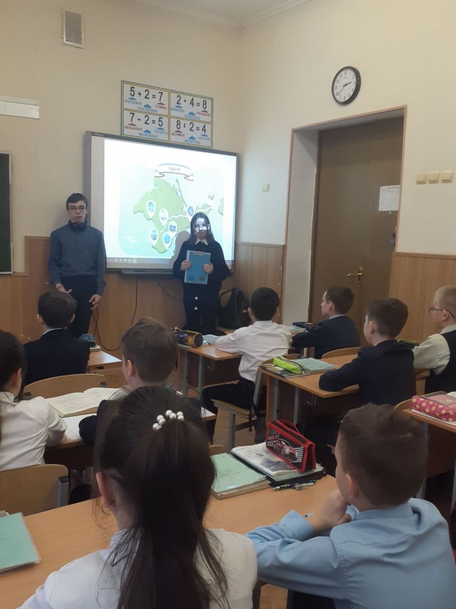 Сегодняшняя тема РОВ - "Воссоединение Крыма с Россией". Благодарим за подготовку и проведение участников 10 А класса Силантьеву Эвелину и Прохорова Владислава разговоры о важном в 4Б классе.