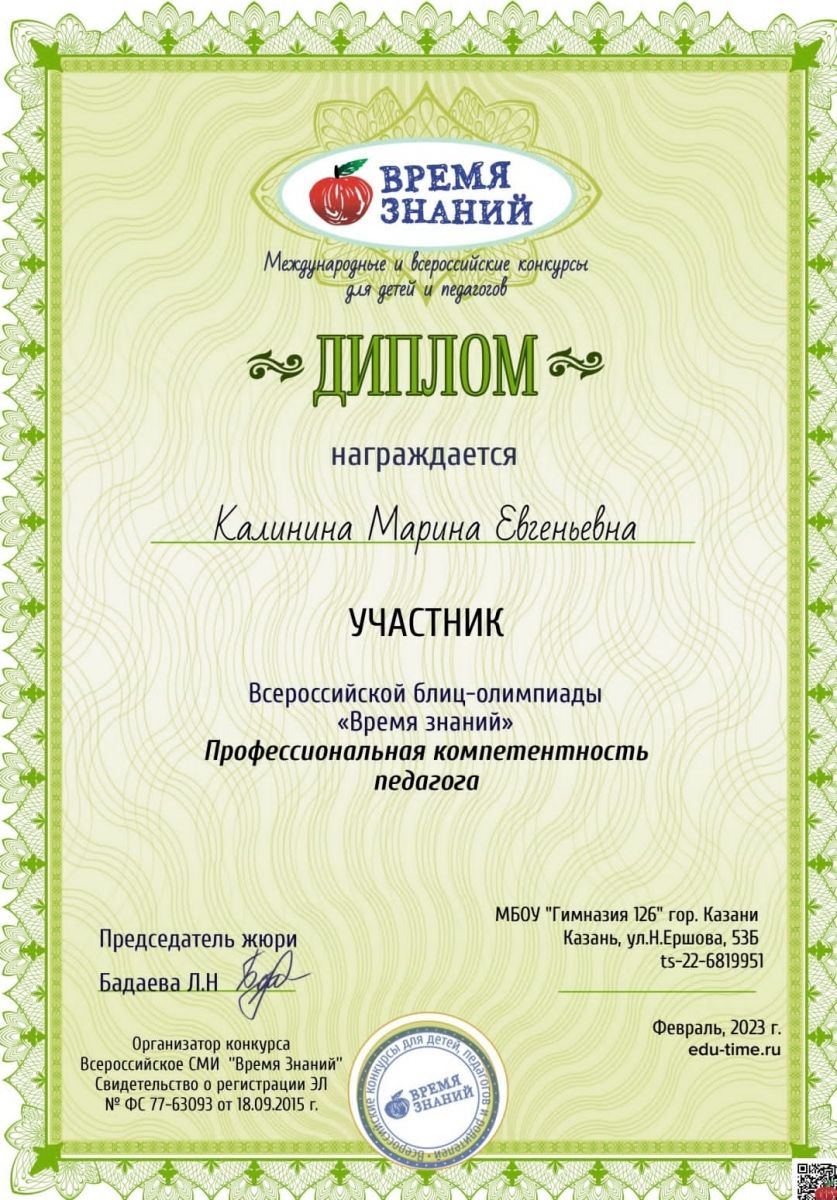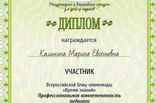 Поздравляем Калинину Марину Евгеньевну, учителя русского языка и литературы - она участник Всероссийской блиц-олимпиады "Время знаний". Благодарим за участие и желаем дальнейших творческих успехов и побед.