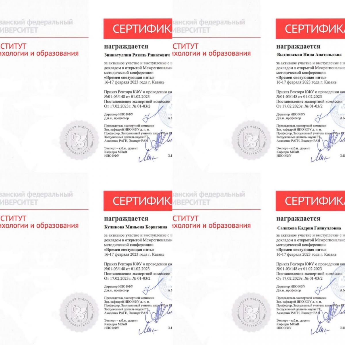 16-17 февраля 2023 года в Институте психологии и образования КФУ прошла открытая Межрегиональная научно-методическая конференция «Времен связующая нить». Обсуждались вопросы: «Особенности применения современных образовательных технологий». «Привлечение внимания к процессам воспитания и обучения в условиях широкого использования цифровых технологий». «Актуальные проблемы теории и практики социальной работы». «Инновационные социально-педагогические технологии в системе образования». «Современные воспитательные технологии в работе с подростками и молодежью». «Особенности применения современных образовательных технологий», а также много других вопросов, которые интересует педагогическое сообщество. Поздравляем участников конференции: Зиннатуллина Разиля Ринатовича, учителя родного языка и литературы; Выгловскую Нину Анатольевну, заведующую библиотекой; Куликову Миньону Борисовну, учителя музыки; Салихову Кадрию Гайнулловну, учителя начальных классов. Желаем дальнейших успехов и плодотворной работы.