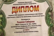 Поздравляем ученицу 4 А класса Сабирову Разалью с победой, Диплом III место за участие в городском экологическом фестивале "Солнечный мост". Благодарим за подготовку руководителей, Новикову Валентину Михайловну и Ануфриеву Юлию Владимировну. Желаем дальнейших побед и творческих успехов.