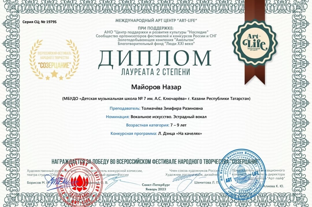 Поздравляем ученика 3 Б класса, Майорова Назара с победой. Он Дипломант II степени, принял участие во Всероссийском фестивале народного творчества "Созерцание". Благодарим за подготовку преподавателя ДМШ №7 Толмачеву Земфиру Разиновну. Желаем дальнейших успехов и творческих побед.