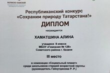 Поздравляем ученицу 8 А класса Хаматшину Алину Диплом III степени в Республиканском конкурсе "Сохраним природу Татарстана" в номинации "Социальный плакат". Благодарим за подготовку учителя биологии Гайнутдинову Резеду Рафаилевну. Желаем дальнейших успехов и побед.