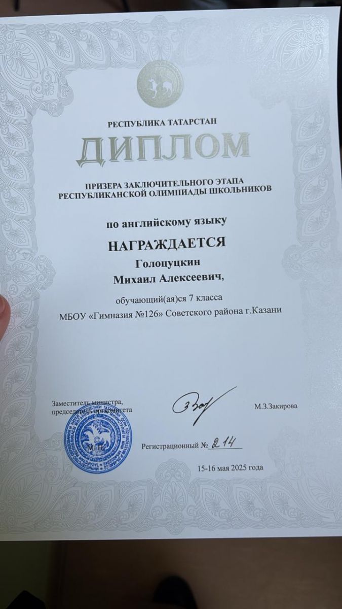 Поздравляем призера заключительного этапа Республиканской олимпиады школьников по английскому языку ученика 7 Б класса
