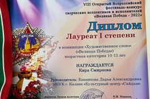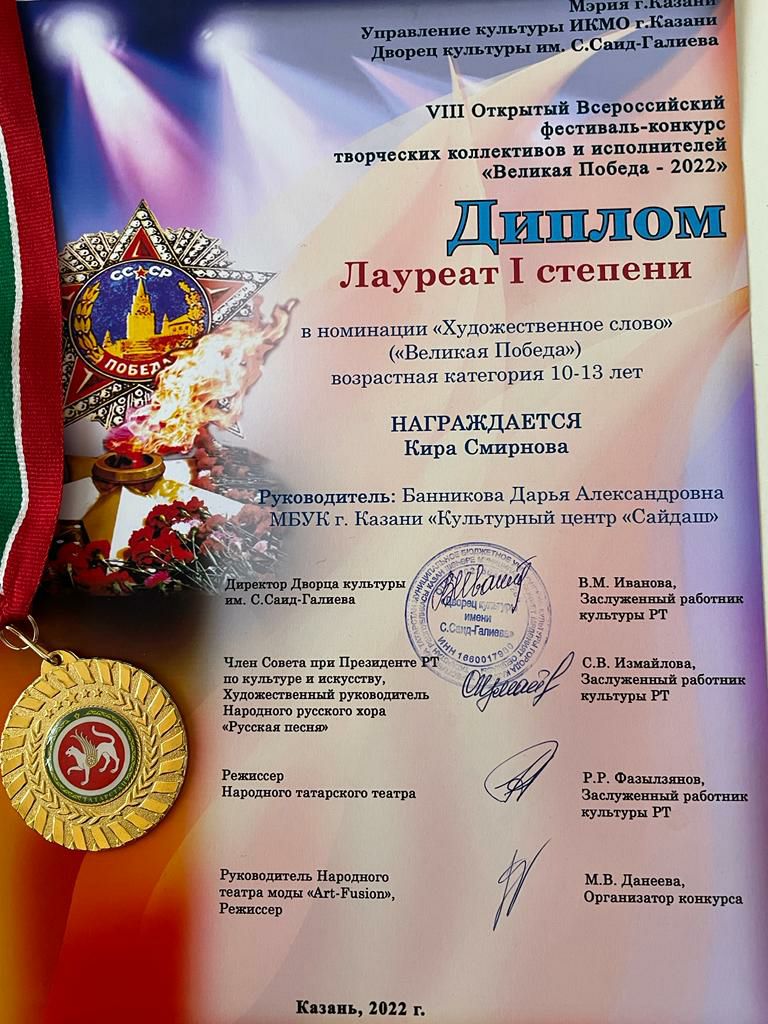 Диплом Лауреата I степени в VIII Открытом Всероссийском фестивале-конкурсе творческих коллективов и исполнителей "Великая Победа-2022". Выражаем благодарность за подготовку педагогу МБУК г. Казани "КЦ Сайдаш" Банниковой Дарье Александровне. Желаем дальнейших успехов и творческих побед.