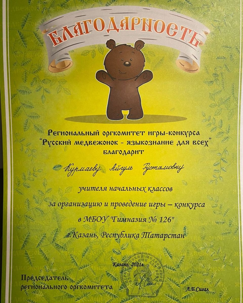 Чтобы преодолеть это заблуждение, открыть детям красоту науки о языке, с 2000 года ежегодно проводится международная игра-конкурс «Русский медвежонок —языкознание для всех». Ежегодно она привлекает около полутора миллионов участников из России и десятков зарубежных стран. Благодарим Курмаеву Айгуль Рустамовну, руководителя ШМО учителей начальных классов за организацию и проведение игры-конкурса в нашей гимназии.