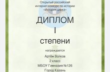 Диплом I степени в открытом российском интернет - конкурсе по истории 08.02.2022
