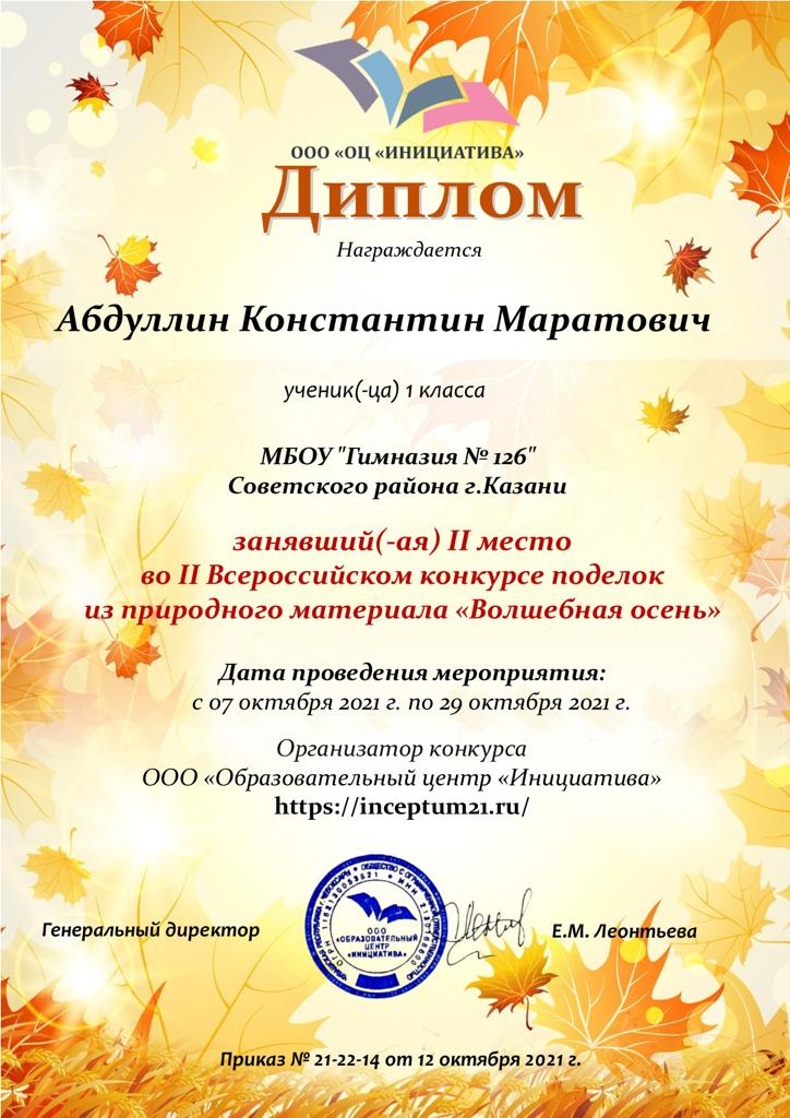 II место во II Всероссийском конкурсе поделок из природного материала «Волшебная очень» 09.11.2021